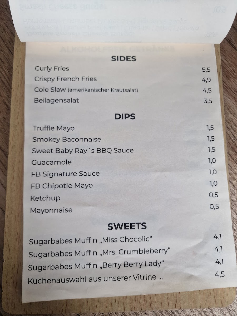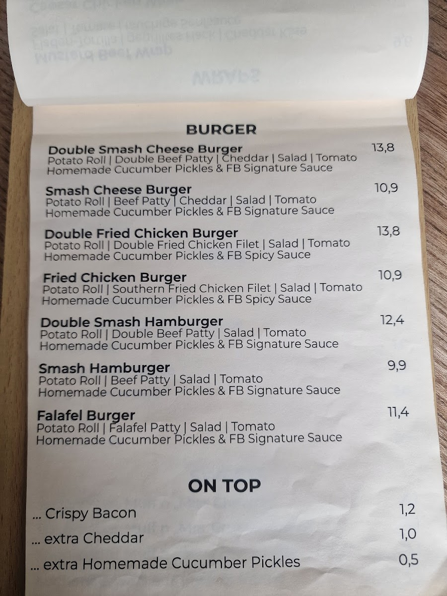 The menu features an array of mouthwatering options, from the classic Hamburger (€8.90) to the indulgent Cheeseburger (€9.90) topped with sharp cheddar. Each burger is crafted with care, using fresh ingredients like homemade cucumber pickles and the FB Signature Sauce that adds a burst of flavor.